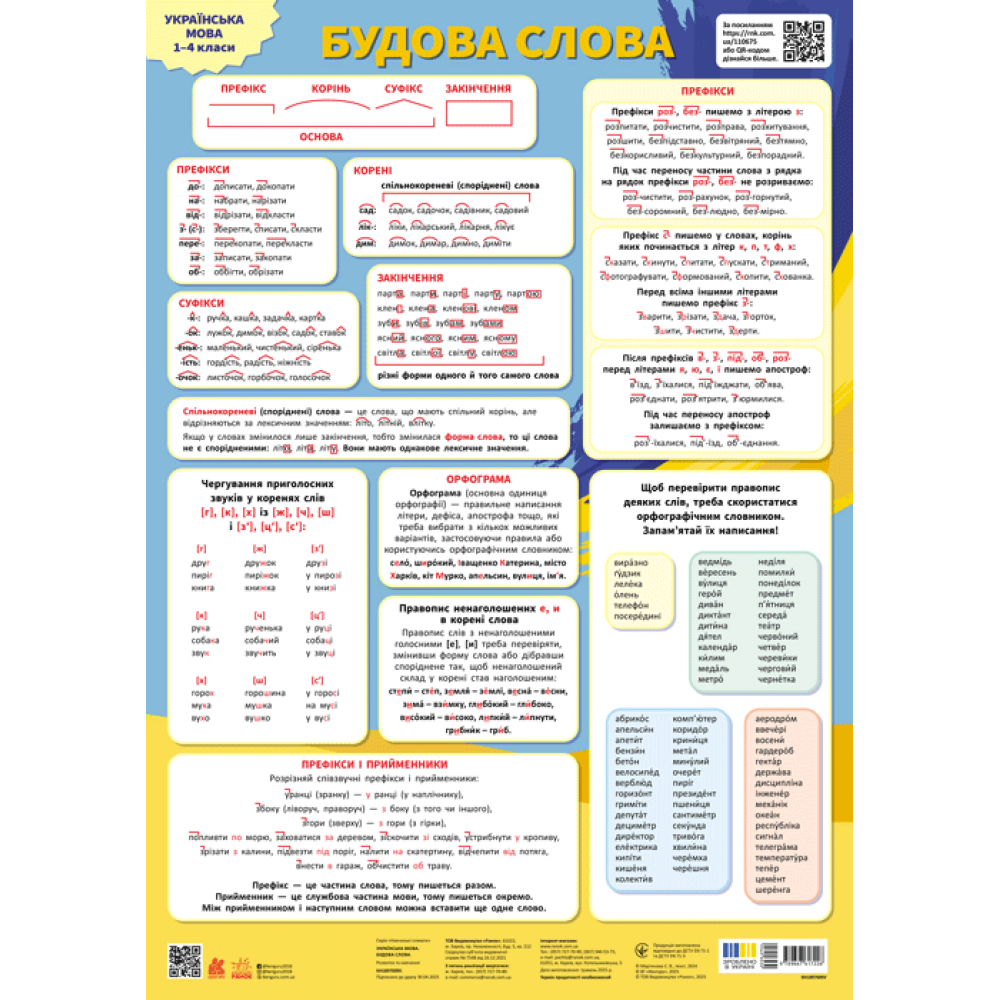 Навчальний плакат «Українська мова. Будова слова» містить систематизовану інформацію щодо будови слова, а саме: про префікс, корінь, суфікс, закінчення слів. Тут надається поняття про спільнокореневі та споріднені слова; орфограми, пояснюється різниця між префіксом і прийменником тощо. Також плакат містить слова, правопис яких треба запам’ятати. Під час навчання учні зможуть швидко знайти потрібні правила на плакатах. А за QR-кодом можна перейти на застосунок і вправлятися у використанні засвоєних правил, виконуючи відповідні завдання.
