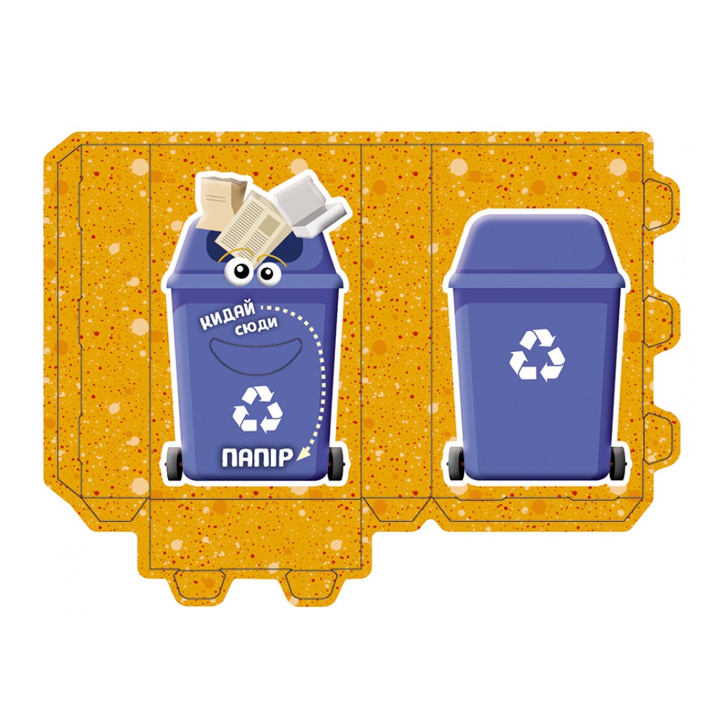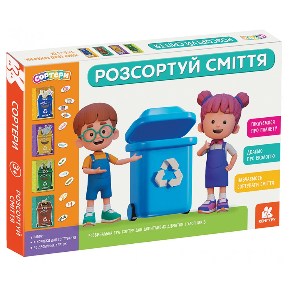 Набір «Розсортуй сміття» із серії «Сортери» містить коробочки із зображенням баків для сміття. Дитина навчається складати коробочки власноруч, сортувати різні види відходів, які можна переробляти, по відповідних баках: «Скло», «Папір», «Пластик», «Органічні відходи». Гра сприяє формуванню в дитини екологічної свідомості, логічного мислення; допомагає зрозуміти, що треба робити для збереження довкілля, навчає систематизувати предмети, розподіляючи їх за певними ознаками.