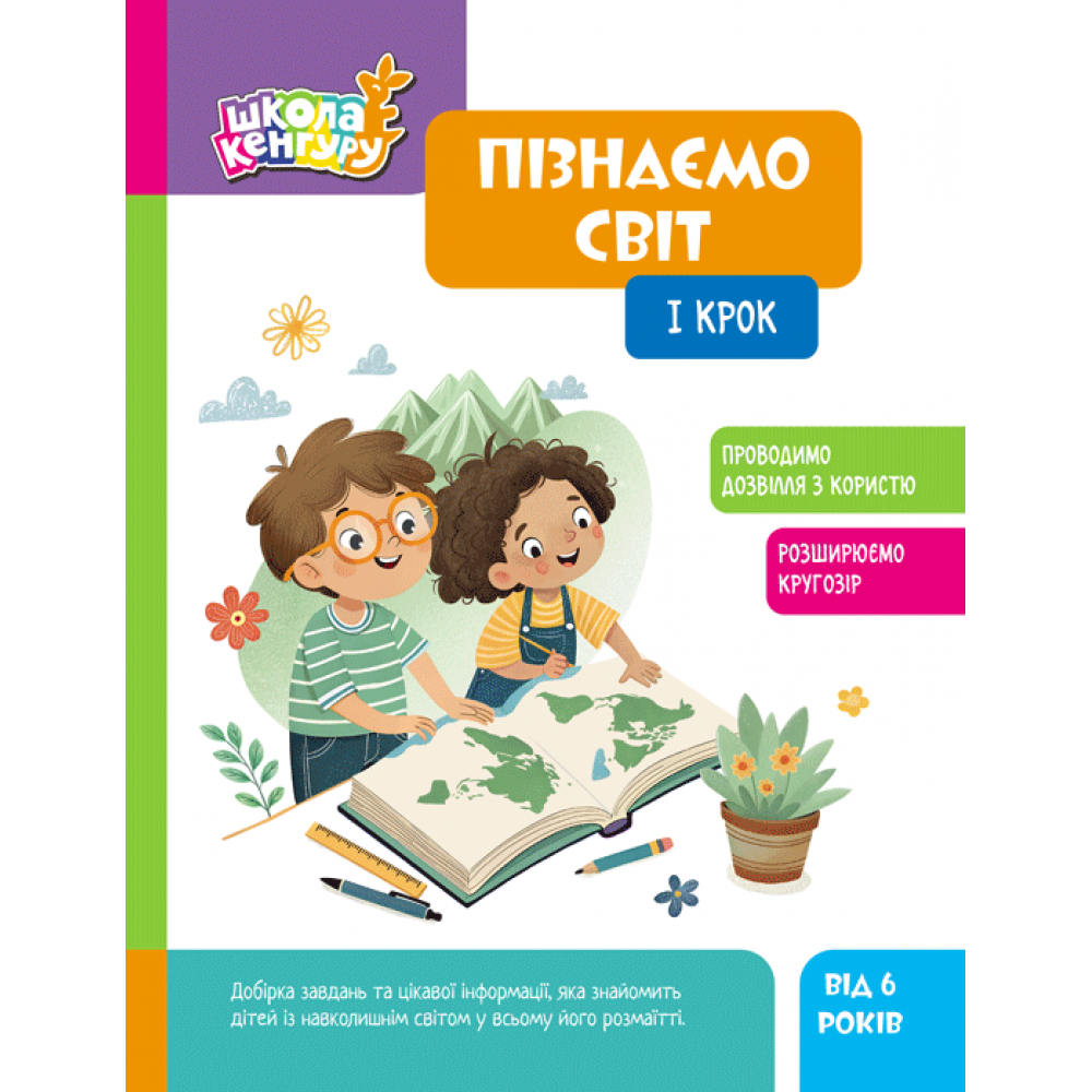 Книжка «Школа Кенгуру. Пізнаємо світ. І крок» містить інформацію про нашу Батьківщину —Україну та її державні символи. До того ж дитина дізнається про планети Сонячної системи; ознайомиться з деякими поняттями, як-от: довкілля, об’єкти живої і неживої природи, рукотворні об’єкти; пори року тощо. Видання допоможе навчитися розпізнавати дерева, кущі, трав’янисті рослини; розрізняти диких і свійських тварин. Книжка сприяє усвідомленню, що людина є частиною живої природи, та нагадує правила поведінки на природі.