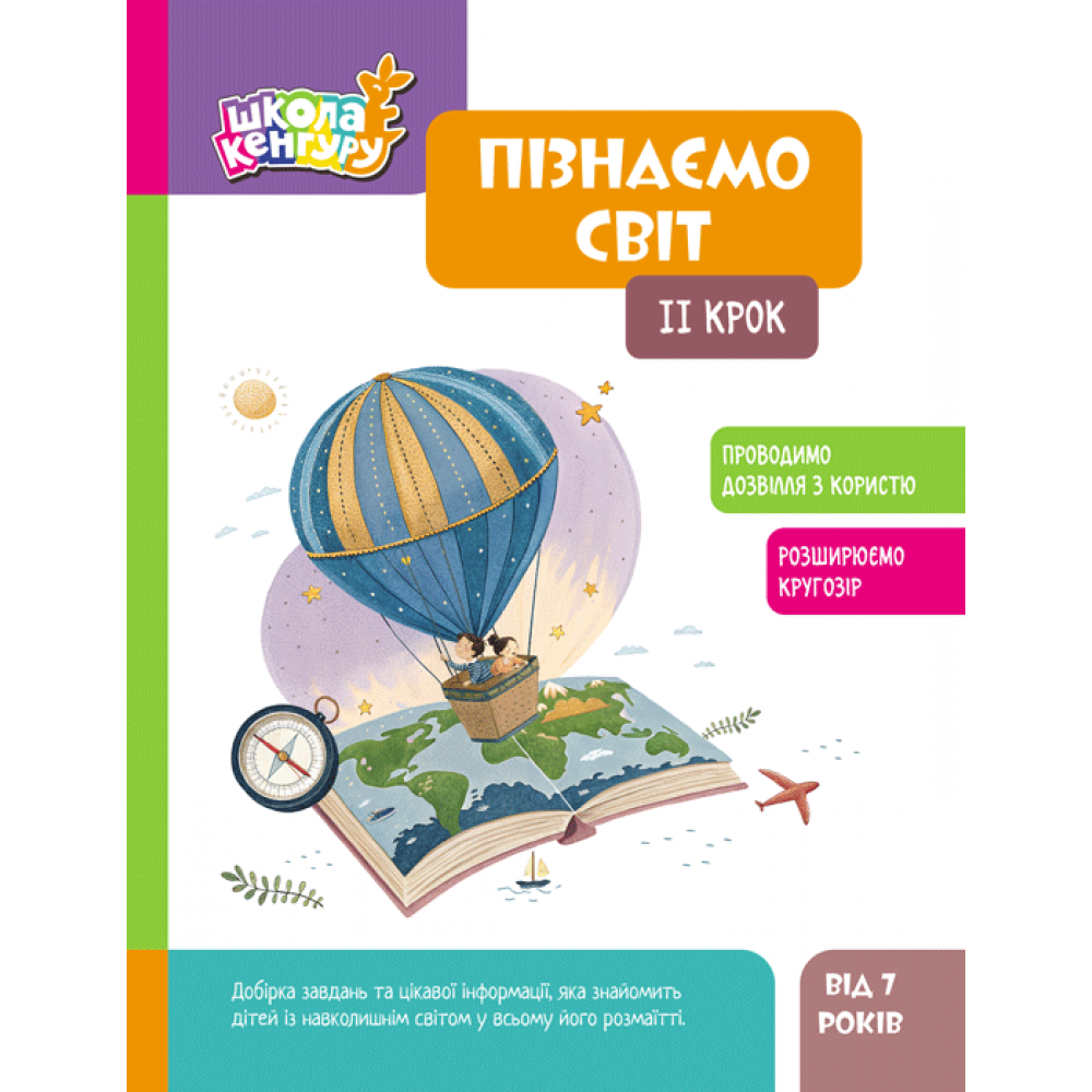 Книжка «Школа Кенгуру. Пізнаємо світ. ІІ крок» розповідає про народні символи України; про зміну дня і ночі на планеті Земля, про частини доби і зміну пір року. Книжка знайомить із календарем, назвами материків й океанів планети. Дитина дізнається, що таке горизонт, які у нього сторони; яку роль у житті людини відіграють повітря та вода і чому був започаткований Всесвітній день води. Будова тіла людини, рослин, ознаки, за якими тварин об’єднують у групи, — про це і багато про що інше можна прочитати у навчальному виданні, написаному простою зрозумілою мовою.