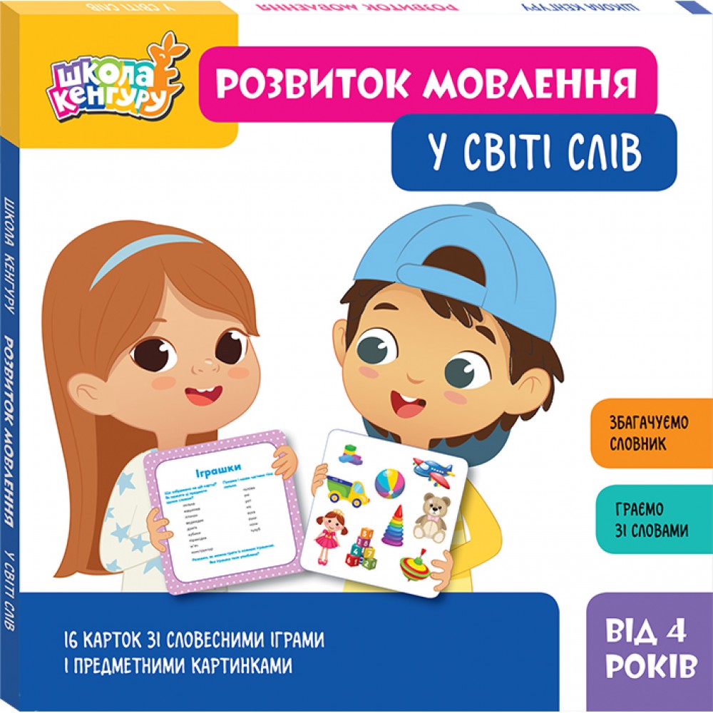«Школа Кенгуру. Розвиток мовлення» — це серія наборів з різноманітними словесними іграми з ілюстраціями, що перетворюють навчання на цікаву гру! Вони спрямовані на формування у дошкільнят правильної звуковимови, збагачення та активізацію словника, розвиток граматично правильного мовлення. Поєднання зорового матеріалу із практикою вербального спілкування позитивно впливає на мовленнєвий розвиток дітей.